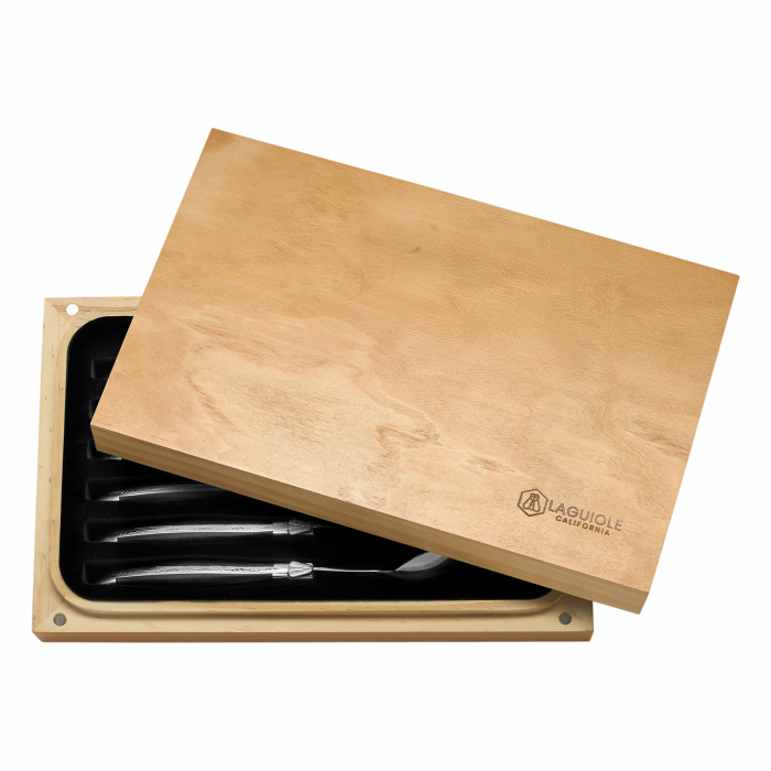 Relying on the old-world, made by hand quality that is synonymous with Laguiole, this 6-Piece Blackwood Spoon Set presented in a California Oakwood Gift Box, makes for an elegant addition to any cutlery collection both at the dinner table and on display.